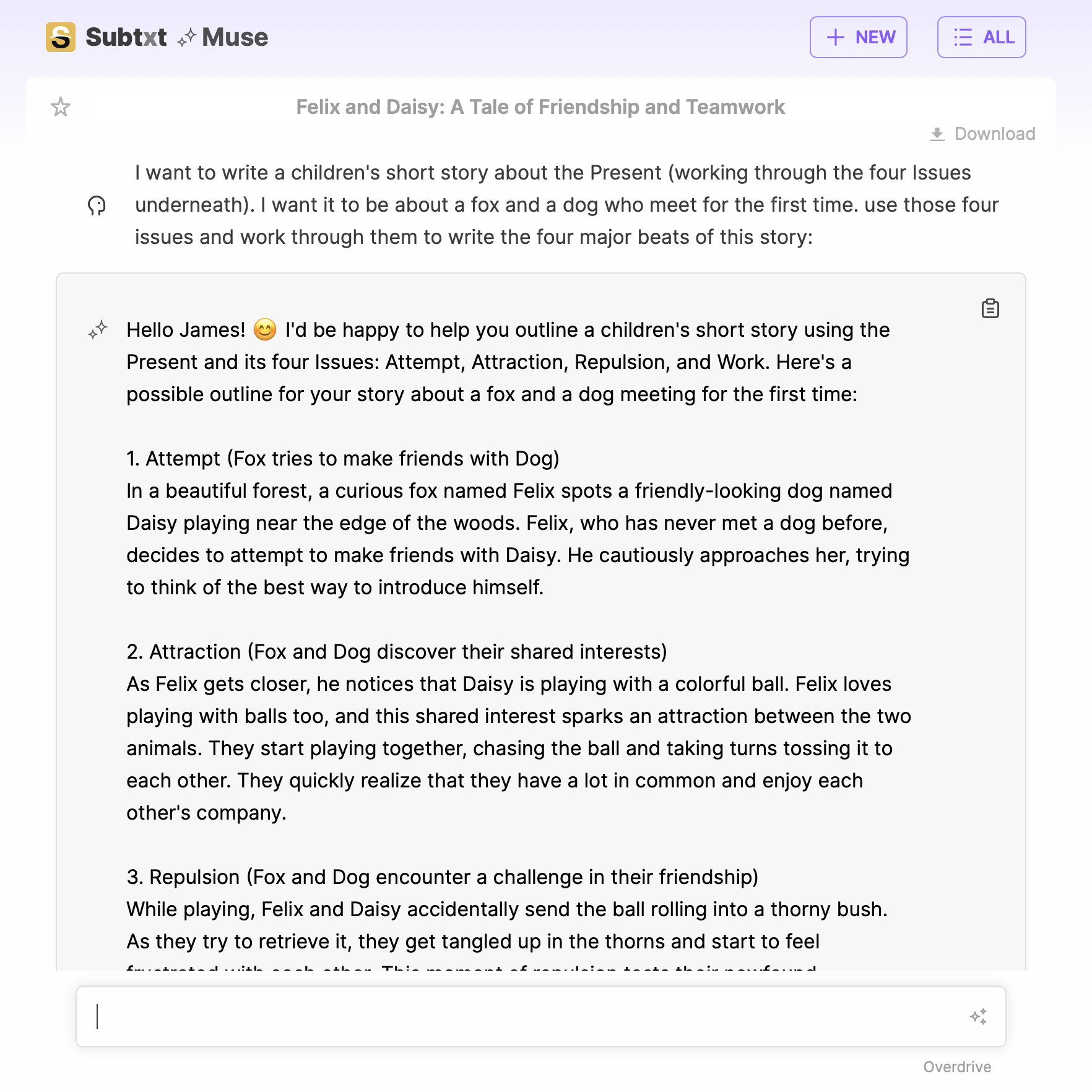 If you’re writing something relatively simple, like a short 1200-1800 word article, or a three to four page short story (even a Calvin and Hobbes-sized comic strip 😃), Subtxt's InstantScene feature can help you structure what happens when.